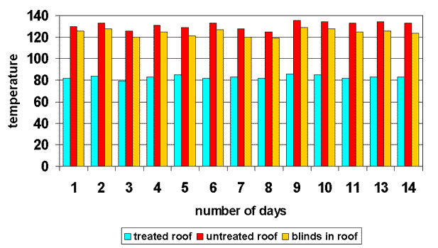 As the graph shows, the internal temperature of the treated roof is dramatically cooler,