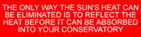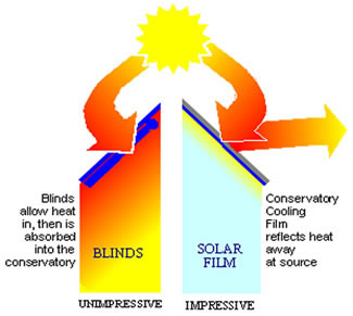 | WHY DOES IT WORK? In the summer, when the sun is high in the sky, up to 85% of the heat in your conservatory enters through your roof. It is therefore clear, that the secret to keeping your conservatory cool lies in controlling the heat before it enters through the roof. Conservatory owners, like you, have endeavoured to solve this problem with fabric and pleated blinds. The performance of these however is poor because a significant amount of the sun's heat still enters the conservatory through the weave of the fabric. So, most of the sun's heat still enters through your roof, leading to excessive temperatures.